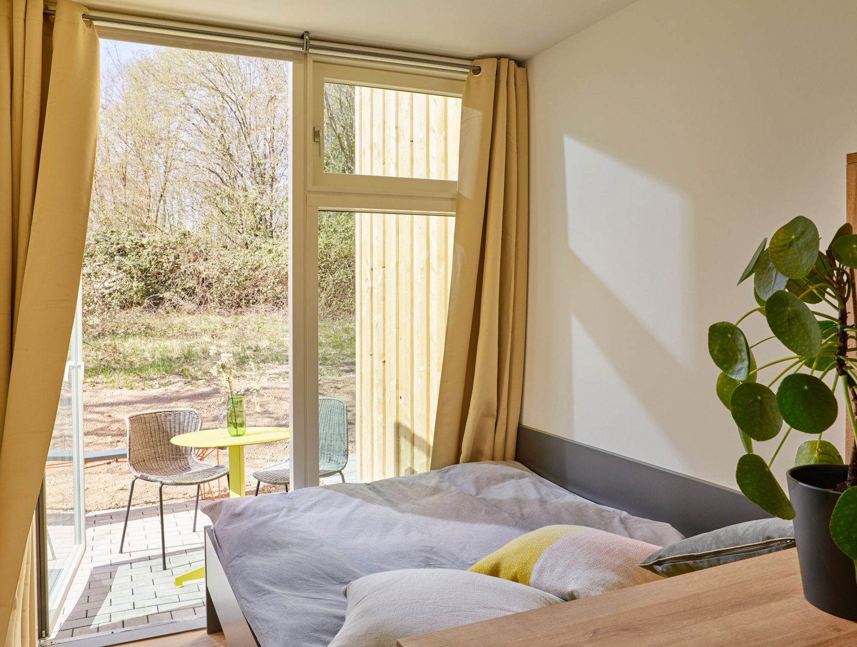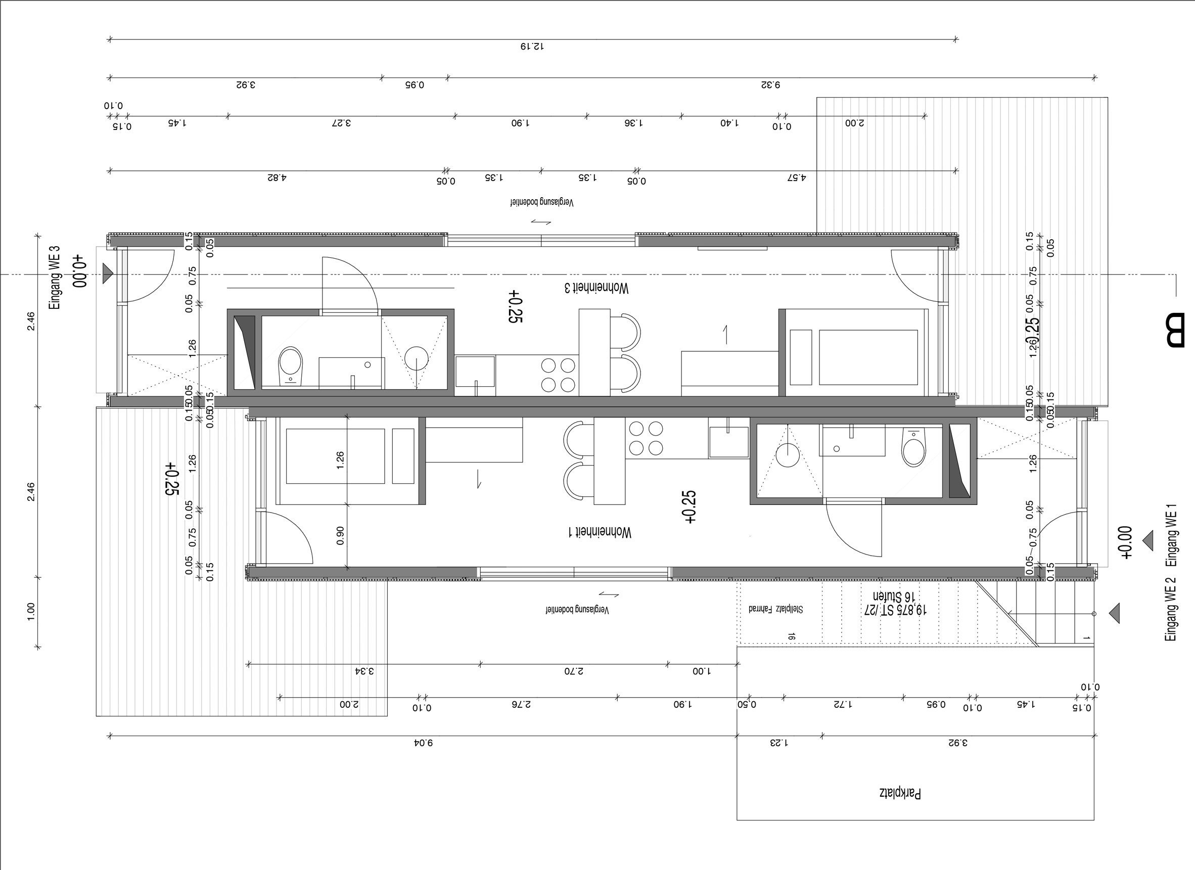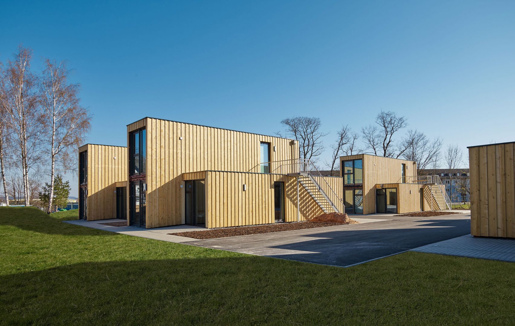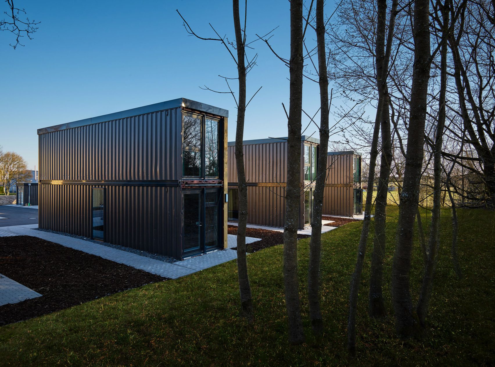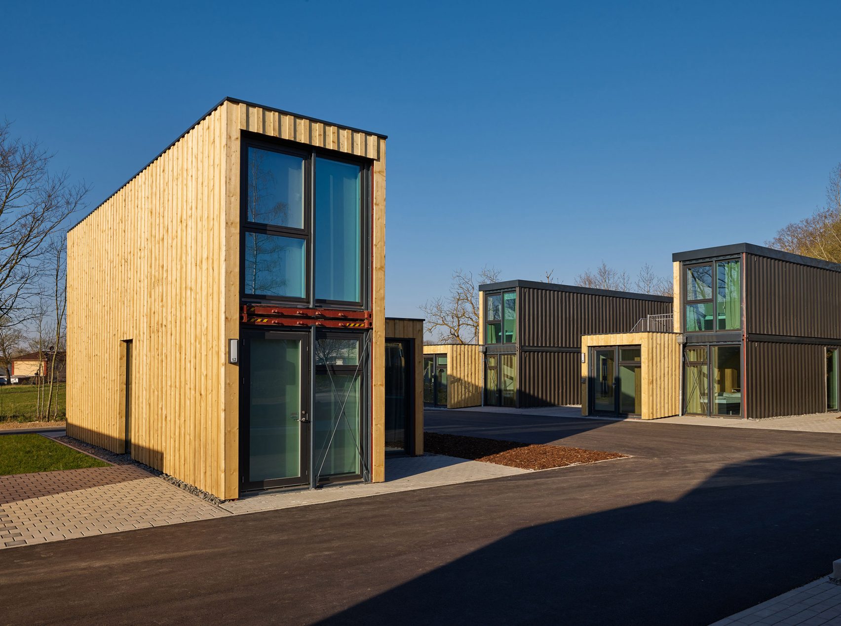 C'est en Allemagne que l'entreprise Containerwerk, spécialisée dans la construction de logements à base de containers, a construit un immeuble de studios, dans un immeuble fait de 21 modules désaffectés. Ils ont été disposés par groupes de trois et la façade métallique a été habillée en bois non traité, afin de devenir un habitat durable. Chaque appartement mesure 26m² et possède l'équipement et le mobilier de base pour être habitable immédiatement.