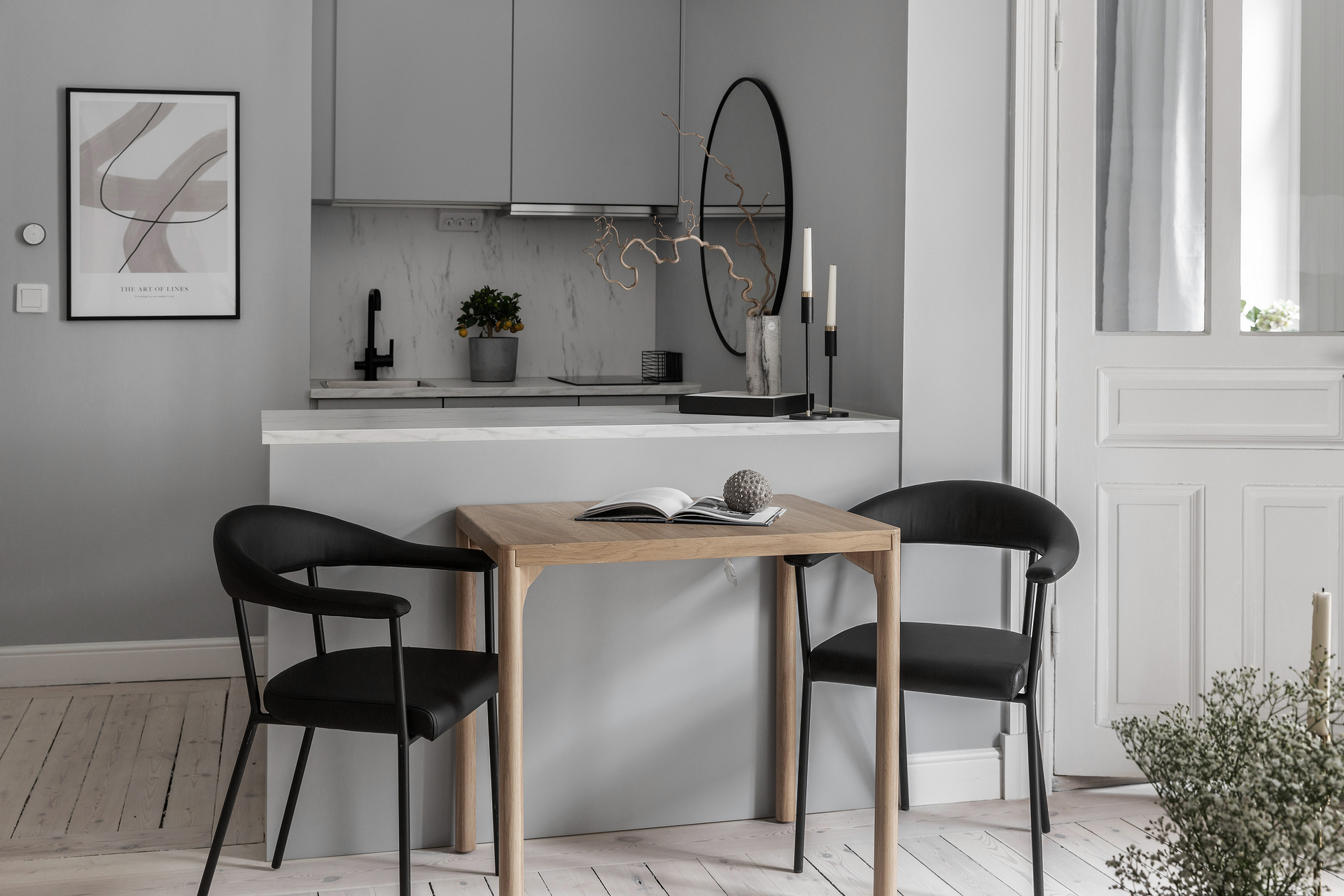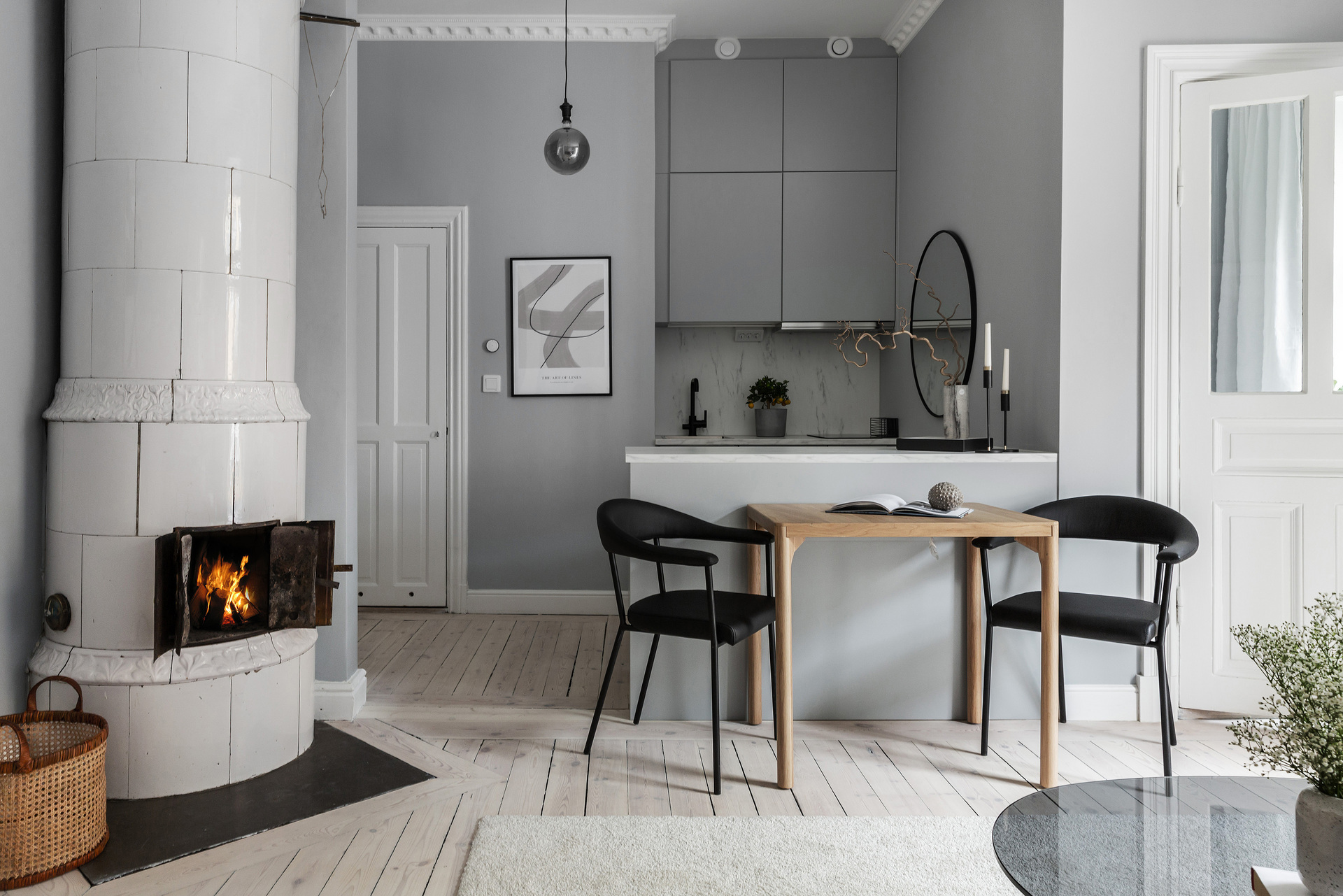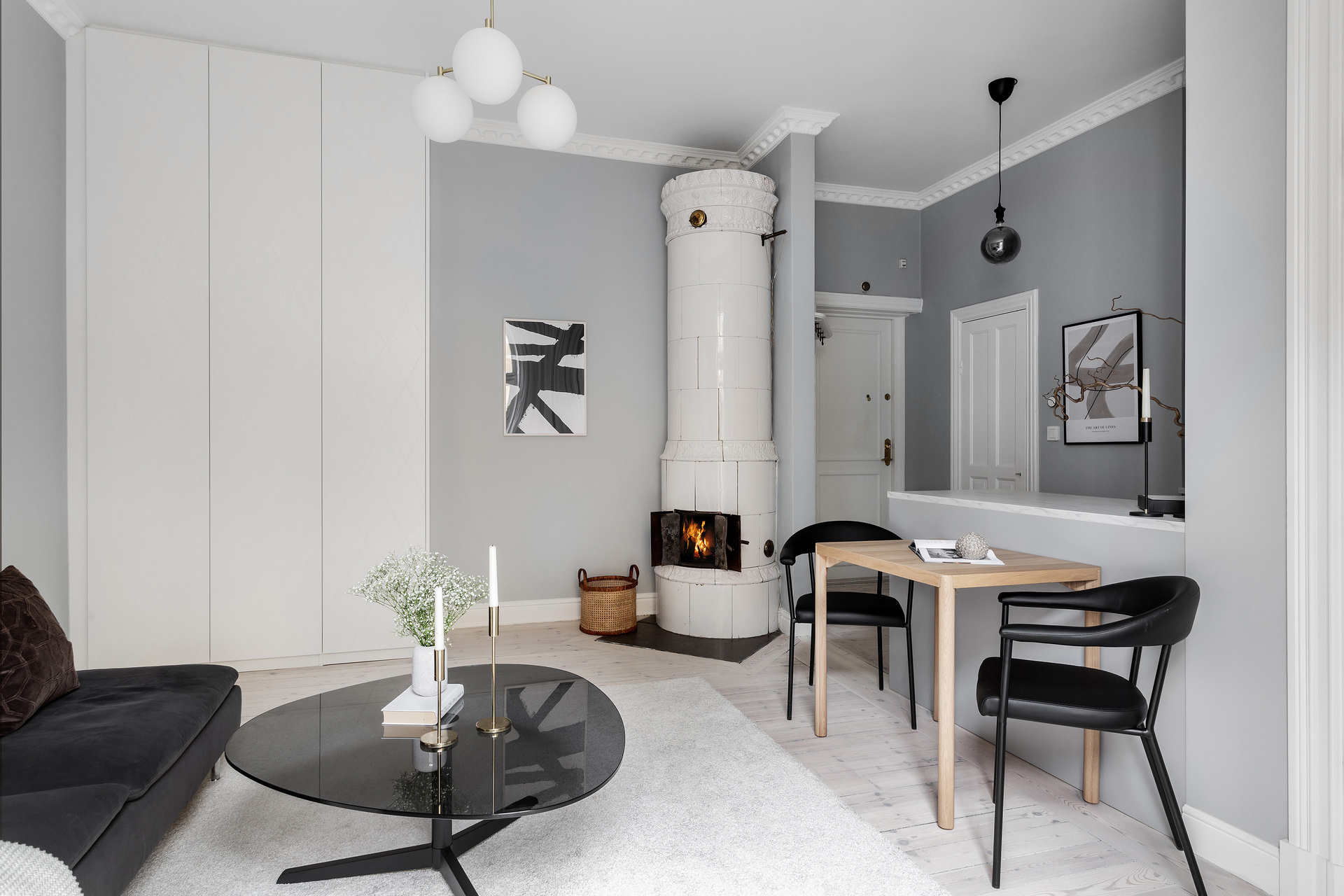 C'est la simplicité de son design intérieur qui caractérise cet appartement de 32m² situé dans un immeuble datant du début du 20e siècle. Le gris prédomine et offre une atmosphère reposante à ce deux-pièces d'une surface moyenne au plan rationnel. Avec sa décoration élégante et très épurée, il laisse la vedette aux beaux éléments de sa période de construction : un poêle en faïence typique des appartements scandinaves, et de magnifiques moulures, ainsi que des portes vitrées à l'ancienne. Un balcon permet de prendre l'air au calme car il donne sur une cour intérieur commune où les habitants trouvent un barbecue, une habitude répandue en Suède.