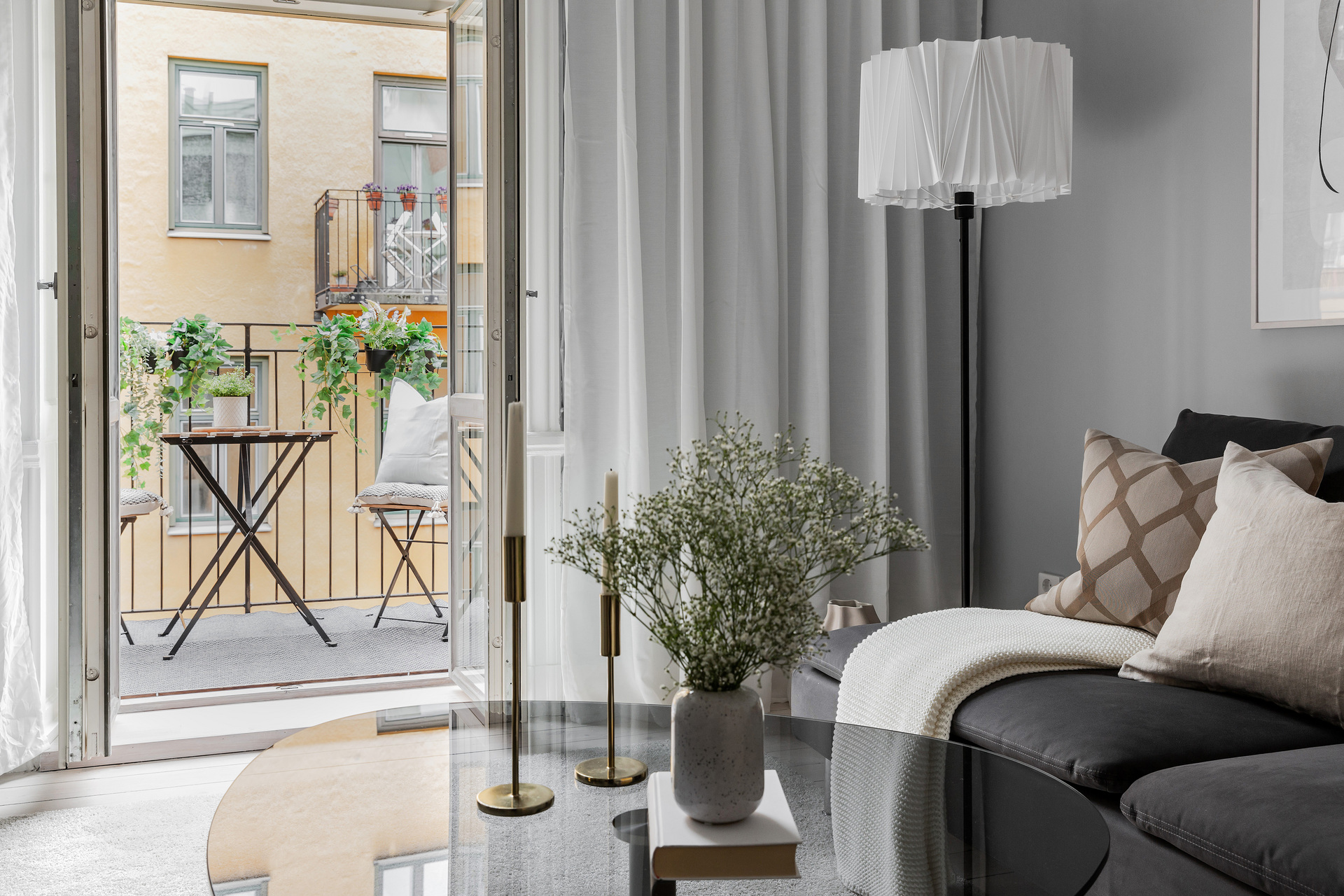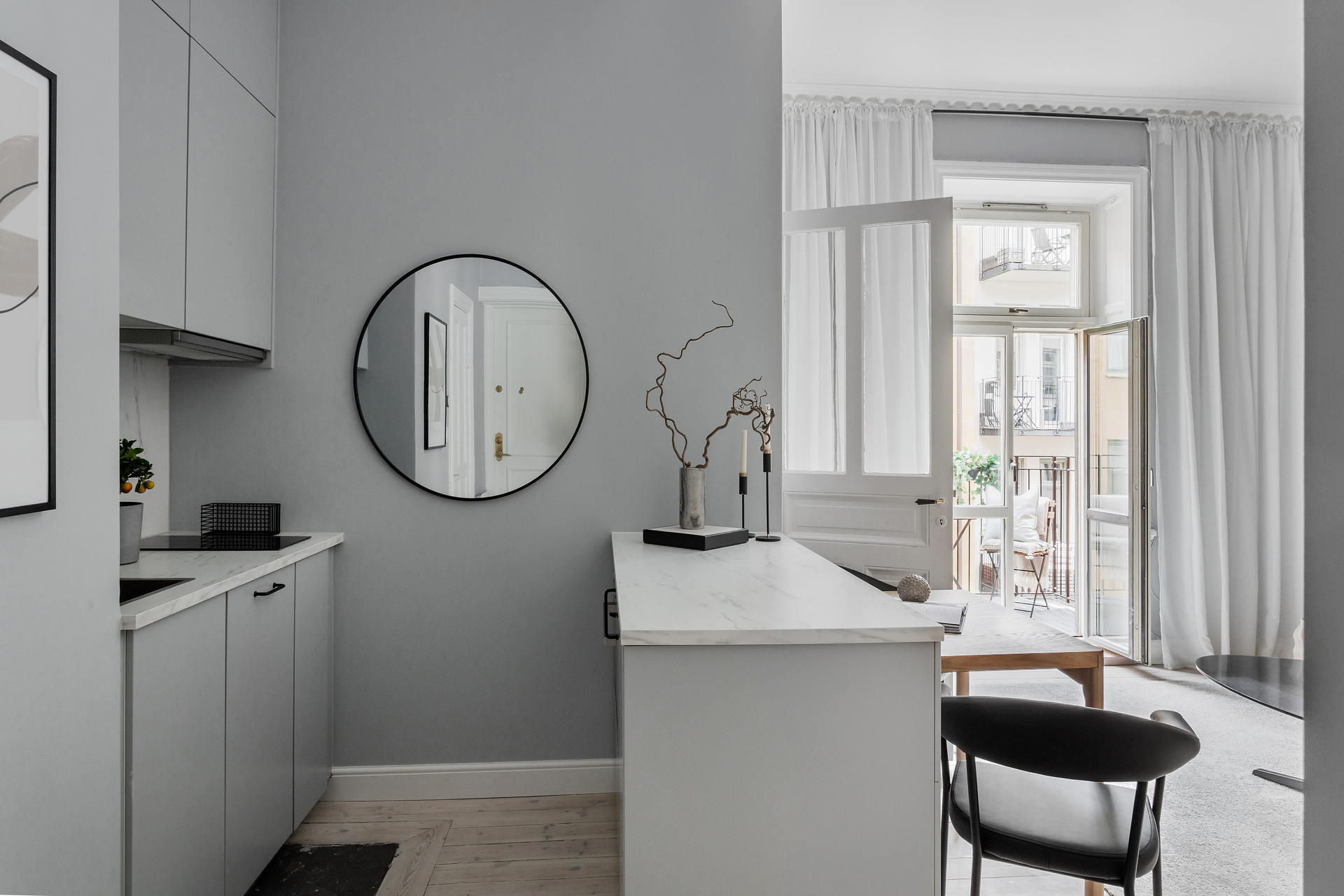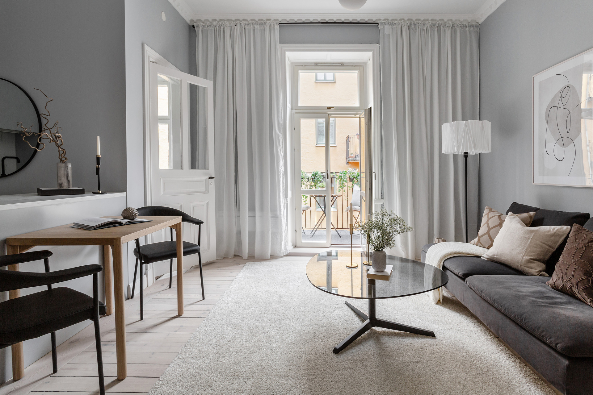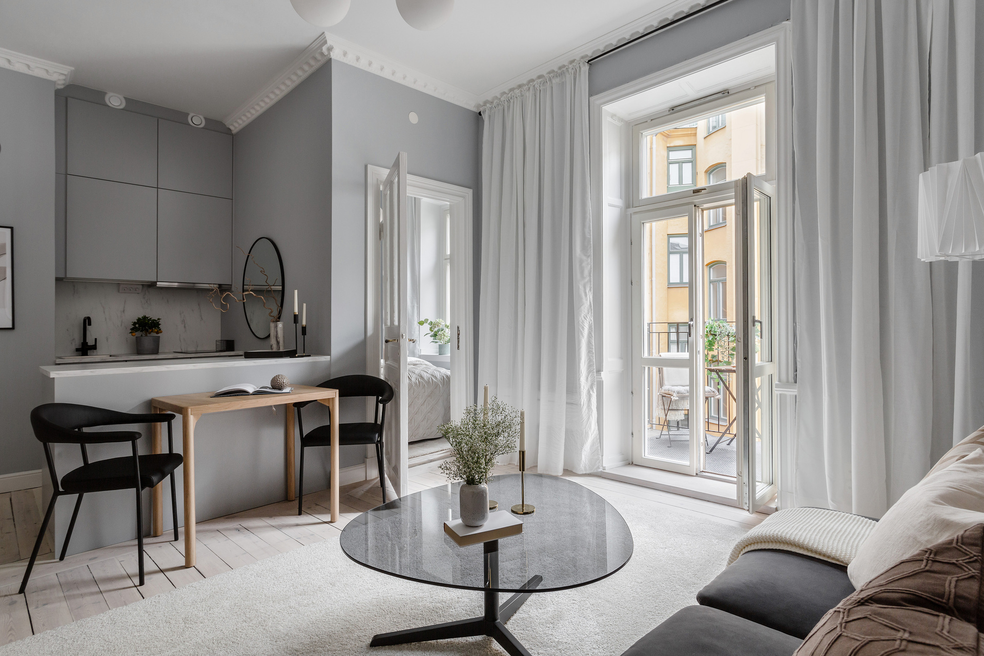 The simplicity of the interior design characterises this 32m² flat in a building dating from the beginning of the 20th century. The predominant colour is grey, which provides a relaxing atmosphere for this medium-sized, streamlined one bedroom apartment. With its elegant and uncluttered decoration, it gives pride of place to the beautiful elements of its period of construction: an earthenware stove typical of Scandinavian flats, and magnificent mouldings, as well as old-fashioned glass doors. A balcony provides a quiet place to take a breath of fresh air, as it overlooks a communal courtyard where the inhabitants have a barbecue, a common practice in Sweden.