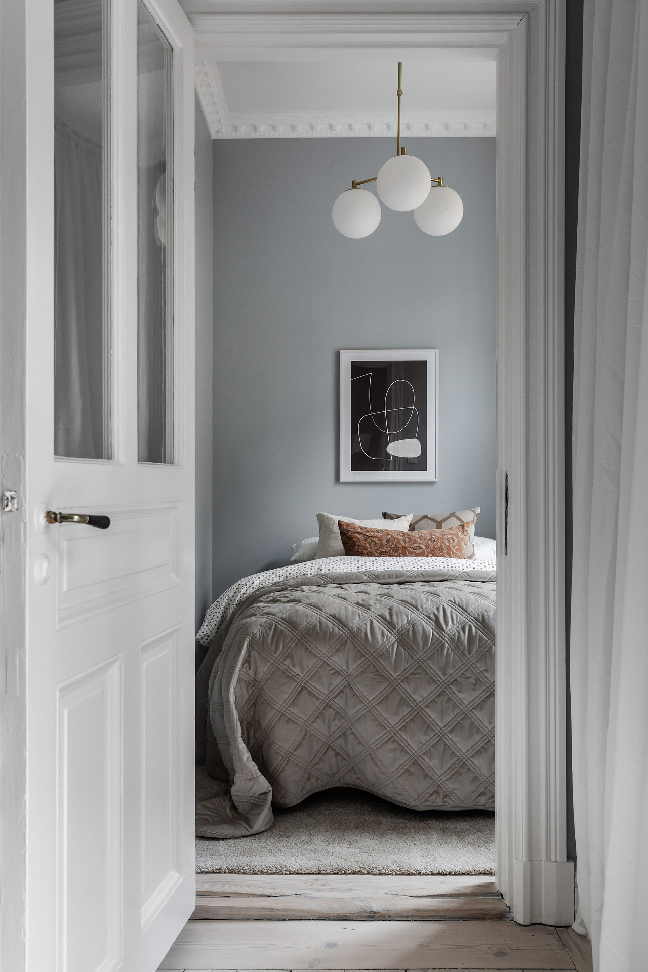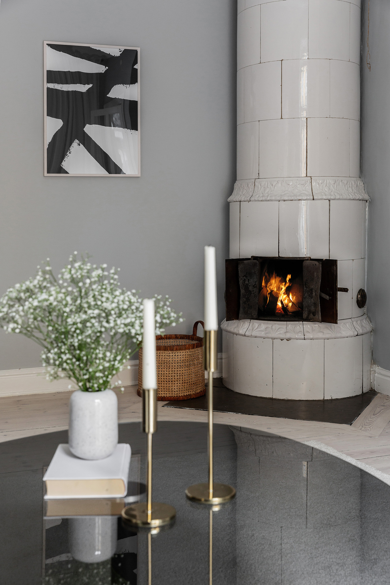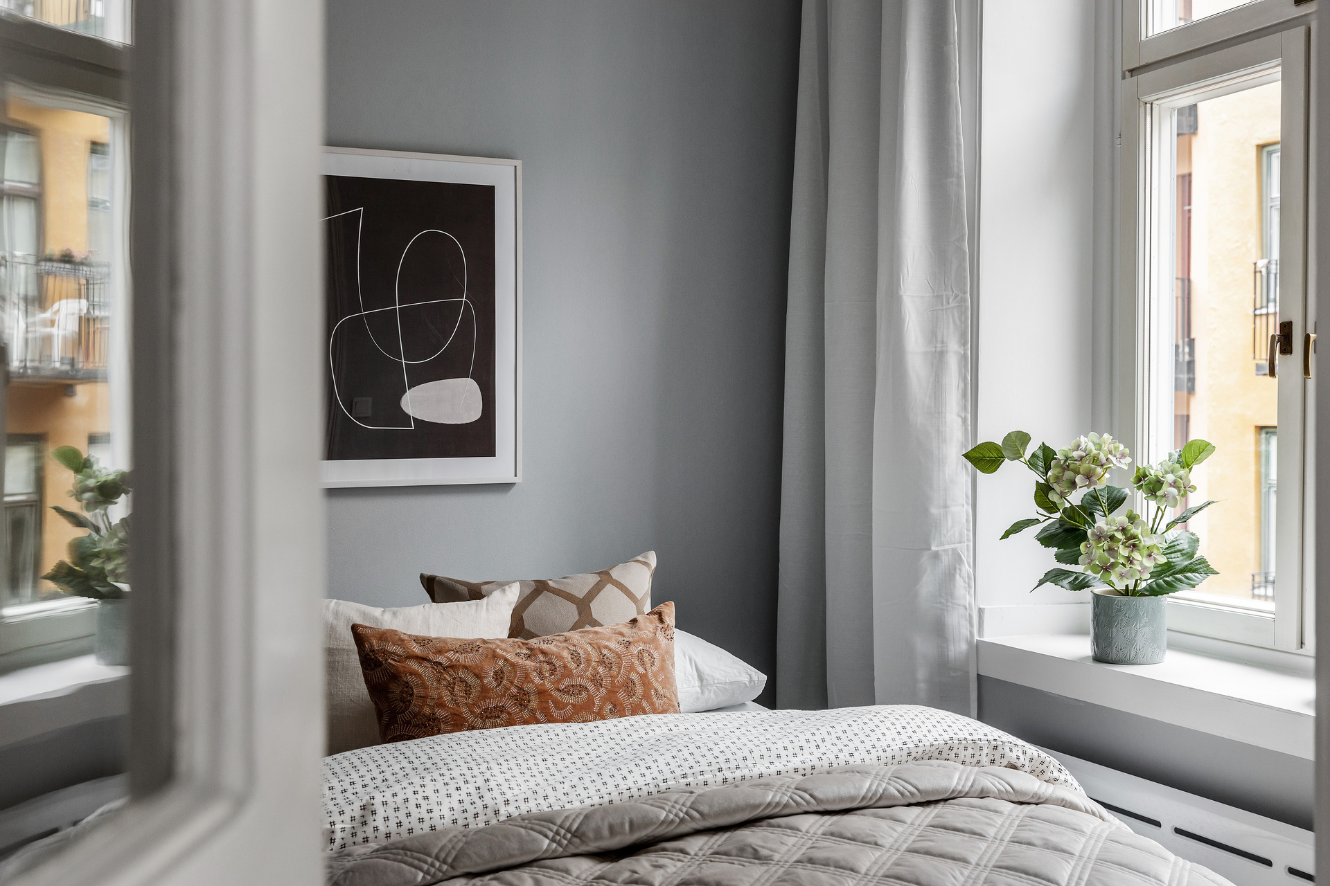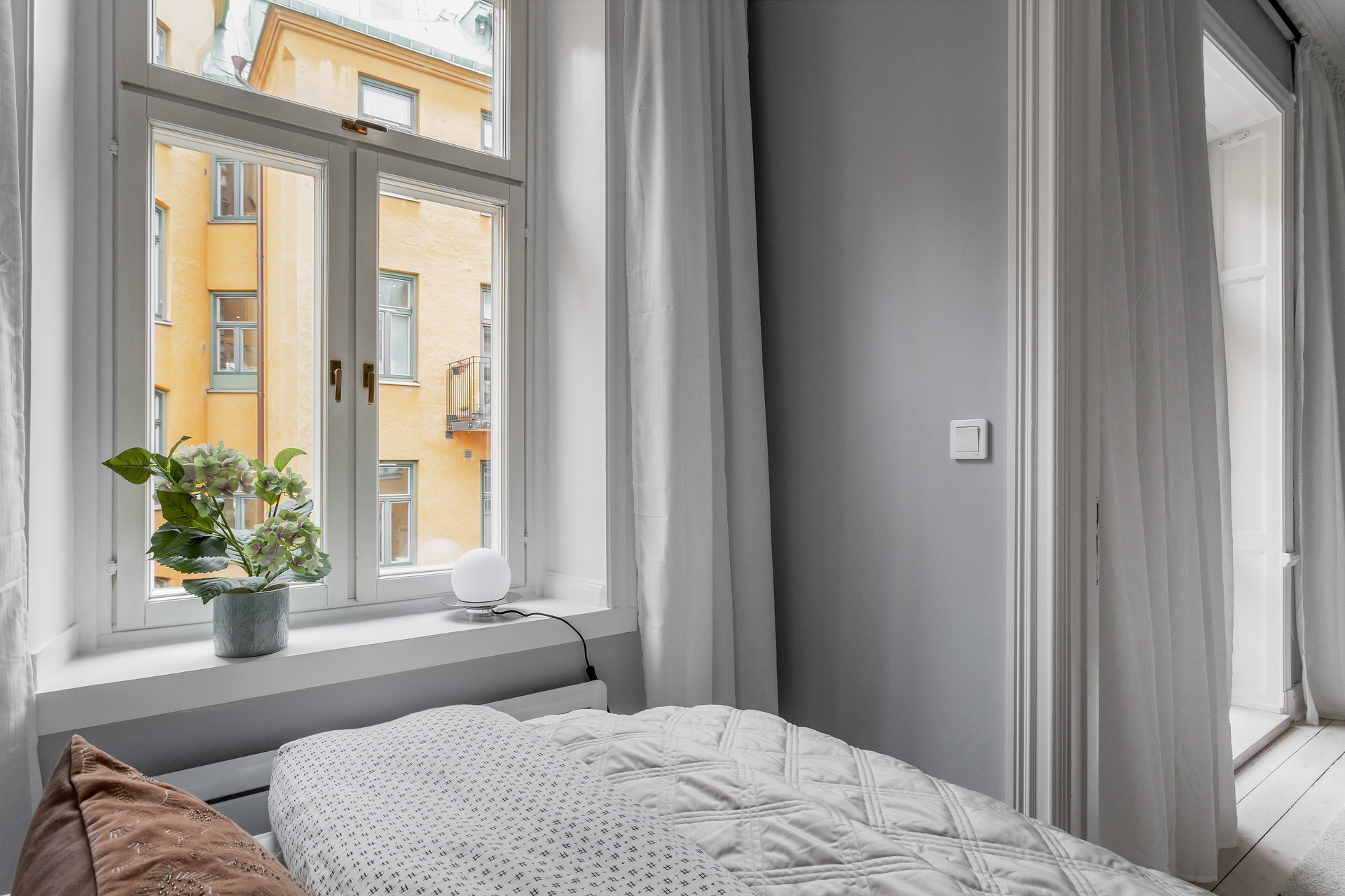 The simplicity of the interior design characterises this 32m² flat in a building dating from the beginning of the 20th century. The predominant colour is grey, which provides a relaxing atmosphere for this medium-sized, streamlined one bedroom apartment. With its elegant and uncluttered decoration, it gives pride of place to the beautiful elements of its period of construction: an earthenware stove typical of Scandinavian flats, and magnificent mouldings, as well as old-fashioned glass doors. A balcony provides a quiet place to take a breath of fresh air, as it overlooks a communal courtyard where the inhabitants have a barbecue, a common practice in Sweden.