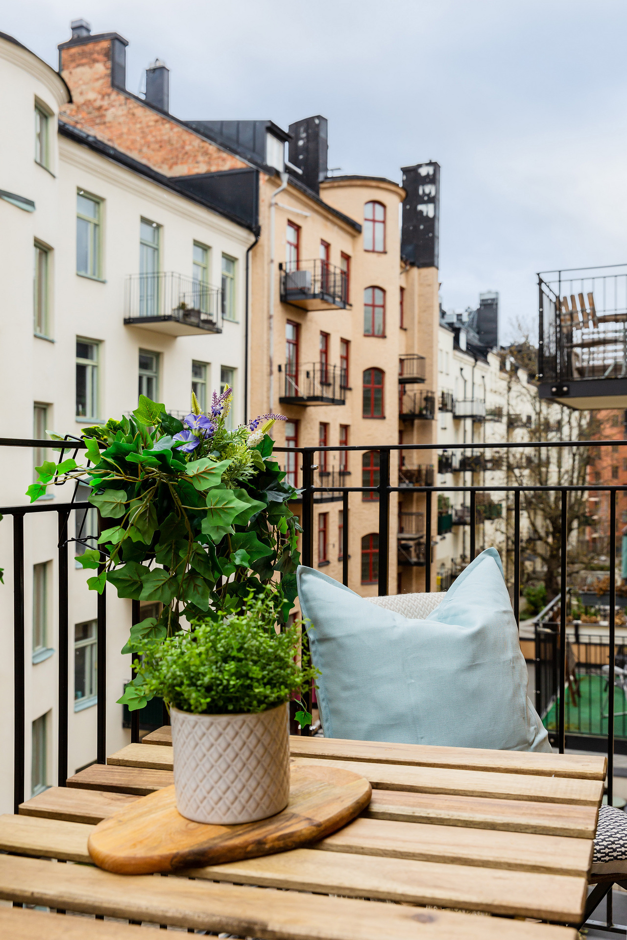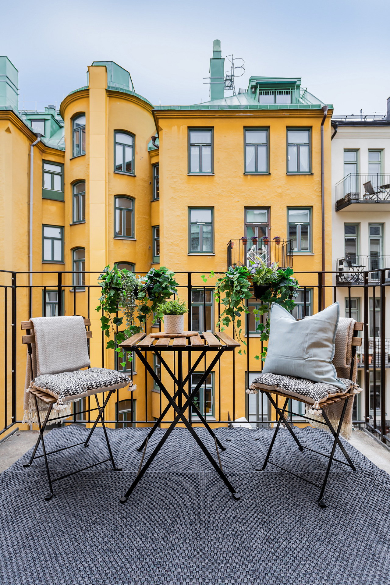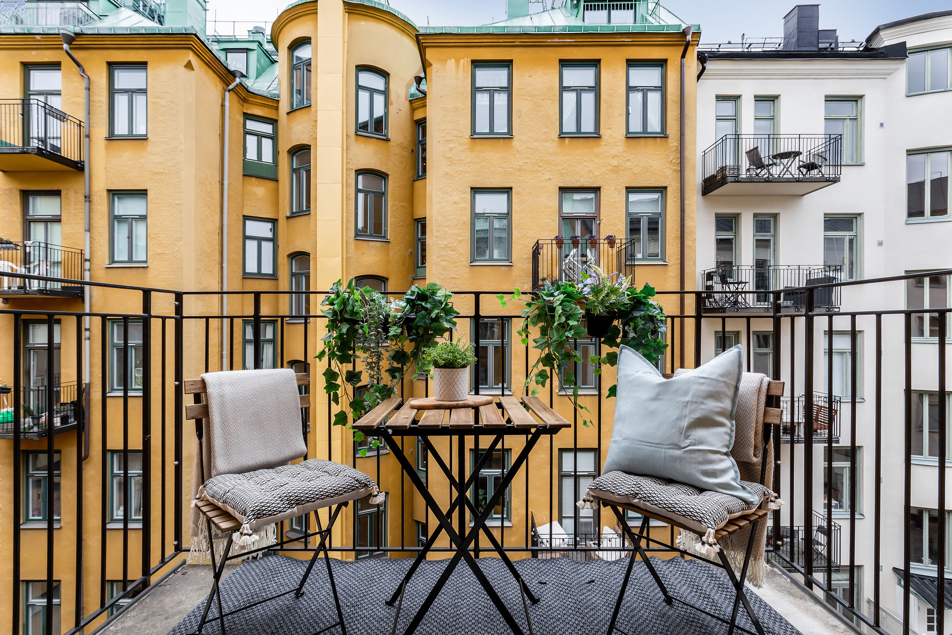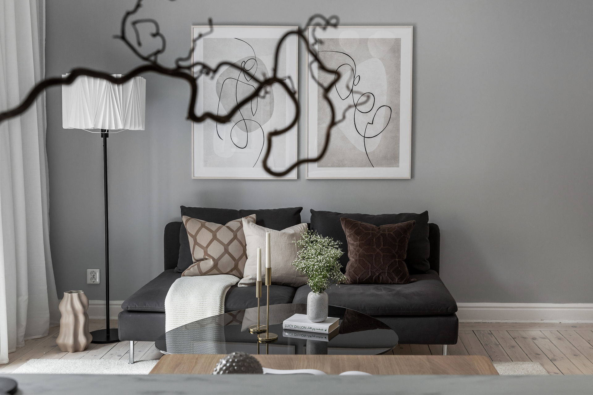 The simplicity of the interior design characterises this 32m² flat in a building dating from the beginning of the 20th century. The predominant colour is grey, which provides a relaxing atmosphere for this medium-sized, streamlined one bedroom apartment. With its elegant and uncluttered decoration, it gives pride of place to the beautiful elements of its period of construction: an earthenware stove typical of Scandinavian flats, and magnificent mouldings, as well as old-fashioned glass doors. A balcony provides a quiet place to take a breath of fresh air, as it overlooks a communal courtyard where the inhabitants have a barbecue, a common practice in Sweden.