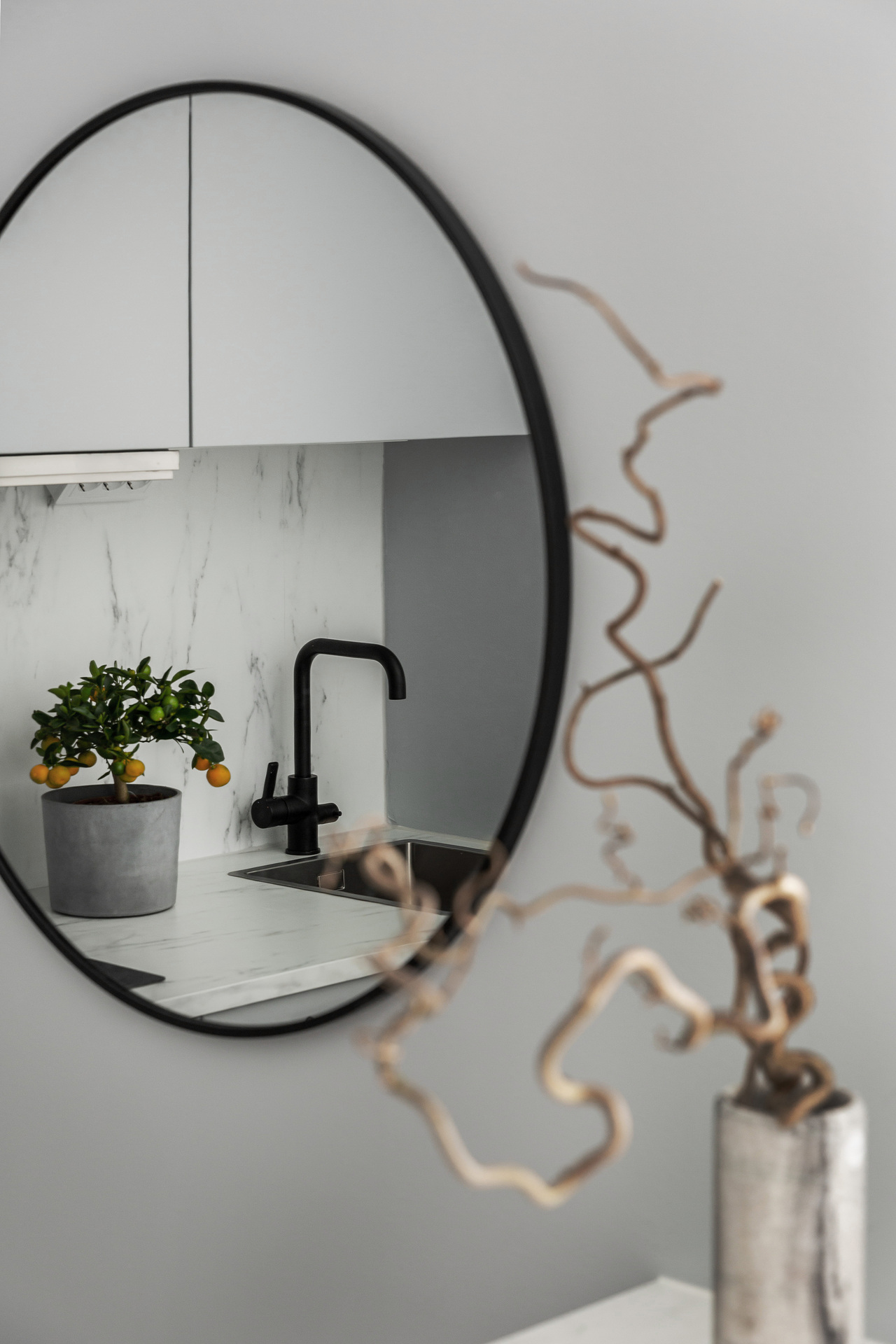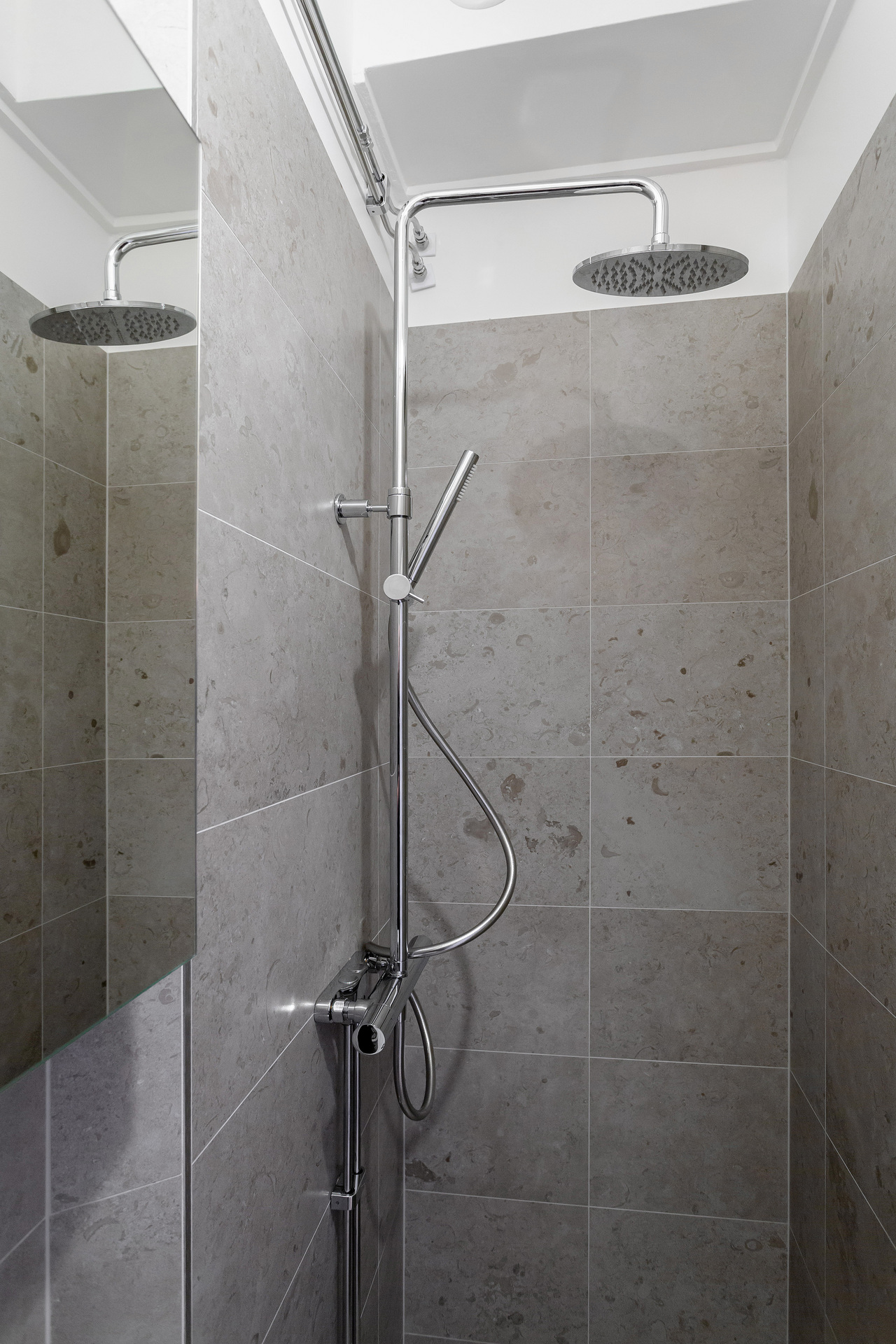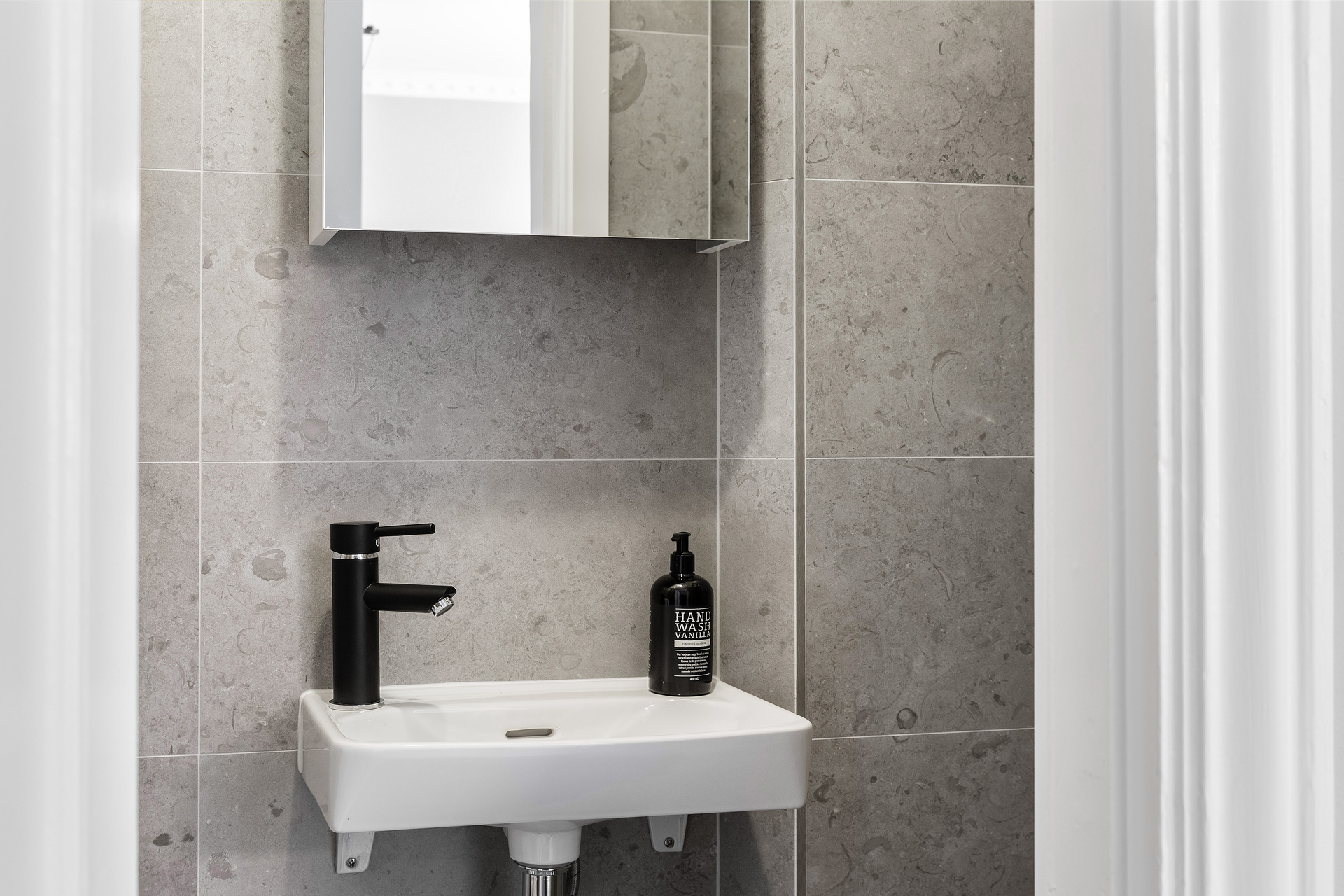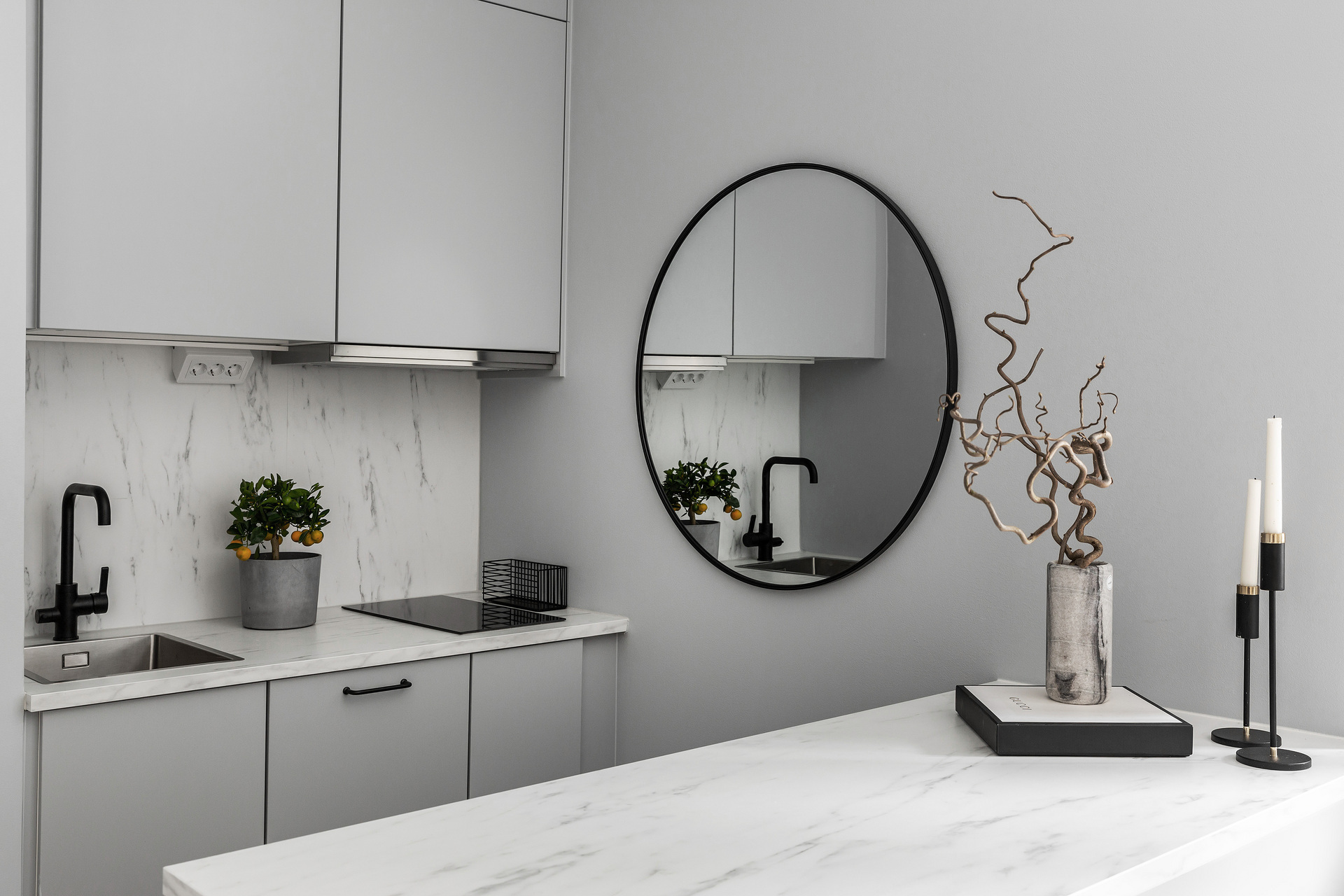 The simplicity of the interior design characterises this 32m² flat in a building dating from the beginning of the 20th century. The predominant colour is grey, which provides a relaxing atmosphere for this medium-sized, streamlined one bedroom apartment. With its elegant and uncluttered decoration, it gives pride of place to the beautiful elements of its period of construction: an earthenware stove typical of Scandinavian flats, and magnificent mouldings, as well as old-fashioned glass doors. A balcony provides a quiet place to take a breath of fresh air, as it overlooks a communal courtyard where the inhabitants have a barbecue, a common practice in Sweden.